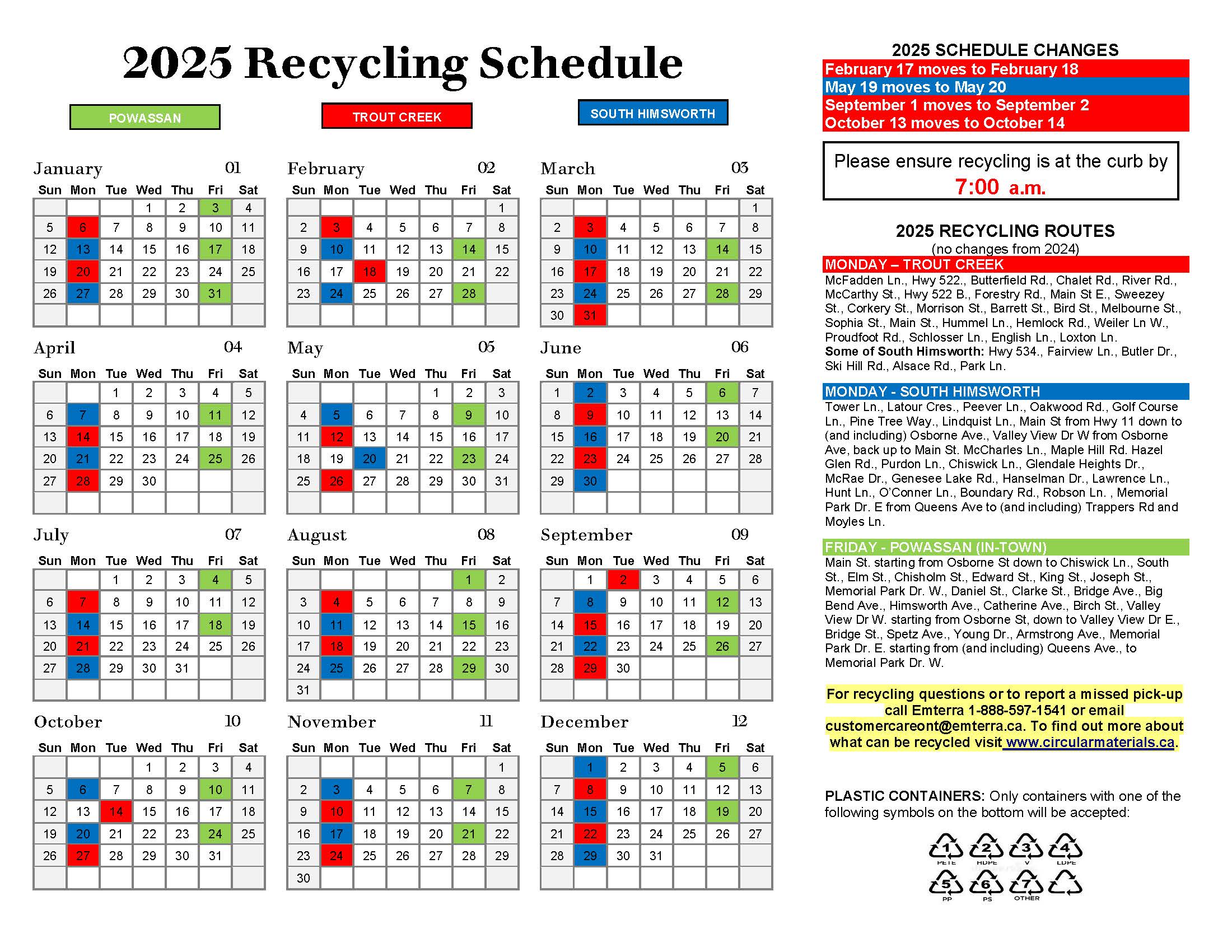 Unplanned changes to the schedule may occur from time to time. Please check the main page of the Municipal website at www.powassan.net, or the Municipal Facebook updates.