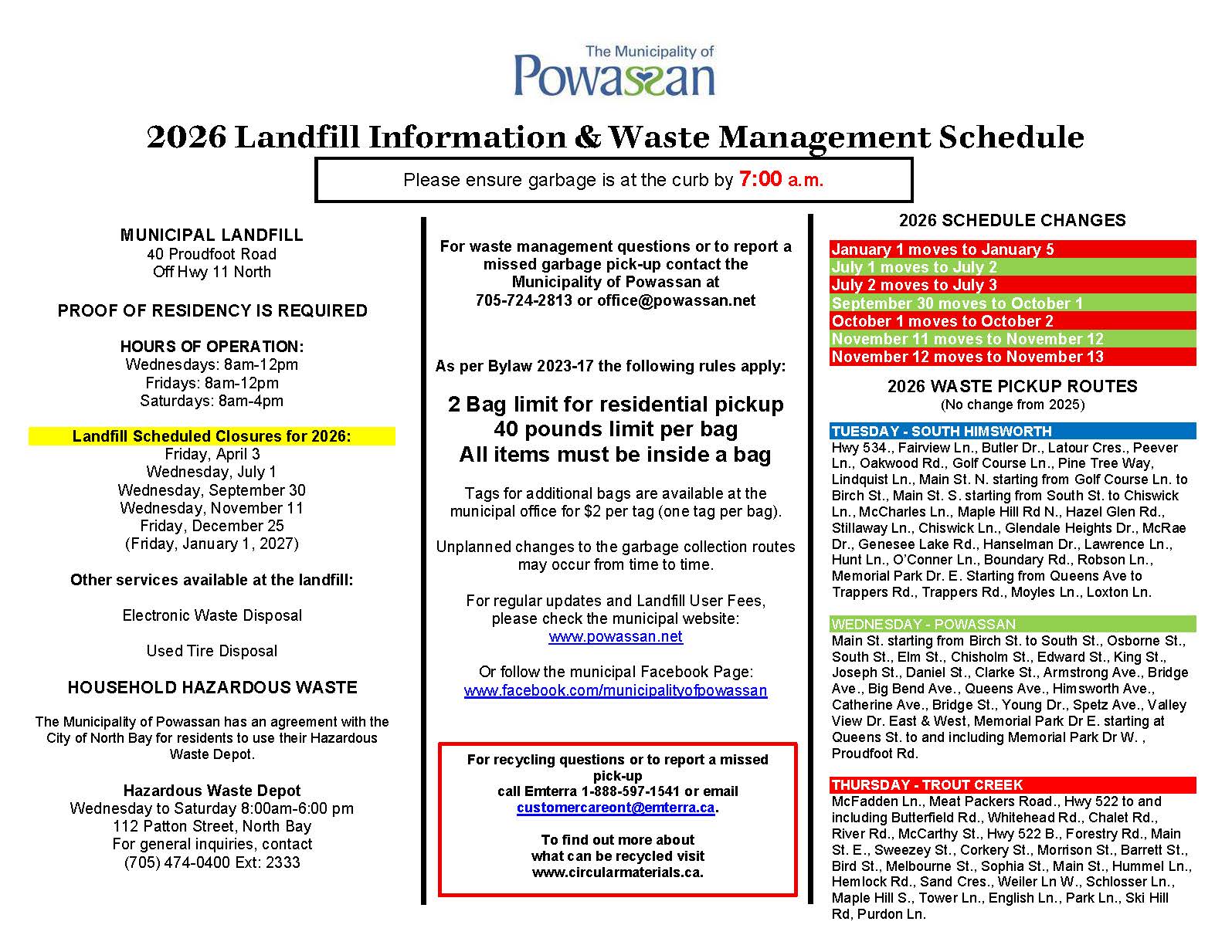 The Municipality provides curbside garbage collection through the Public Works Department. For concerns regarding garbage collection please contact the Municipal Office at 705-724-2813, ext 221 or email office@powassan.net.