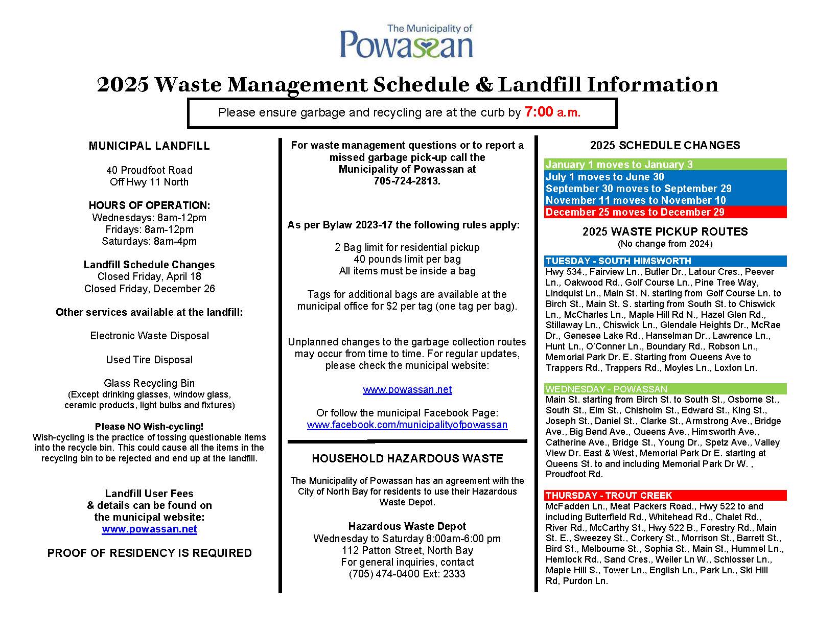 Unplanned changes to the schedule may occur from time to time. Please check the main page of the Municipal website at www.powassan.net, or the Municipal Facebook updates.